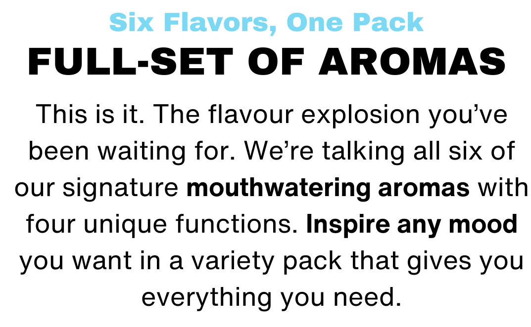 Get ready for a flavor experience like no other. This pack brings you all six of our signature, irresistible aromas, each crafted with five distinct functions. Elevate any mood you desire with this all-in-one variety pack, giving you everything you need to transform your vibe.